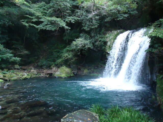 落差3m、幅2mの滝で、辺りの岩(玄武岩)の模様が蛇のうろこのように