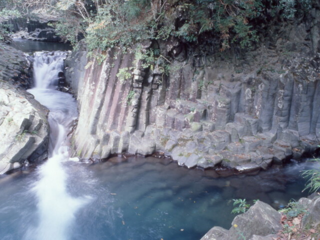 登り尾南火山の溶岩流が滝の両側に美しい柱状節理を作り出しています。