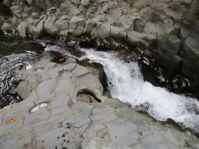 猿田淵には川底に溶岩が現れ、磨き上げられた溶岩の上を滑るように川が流れています。